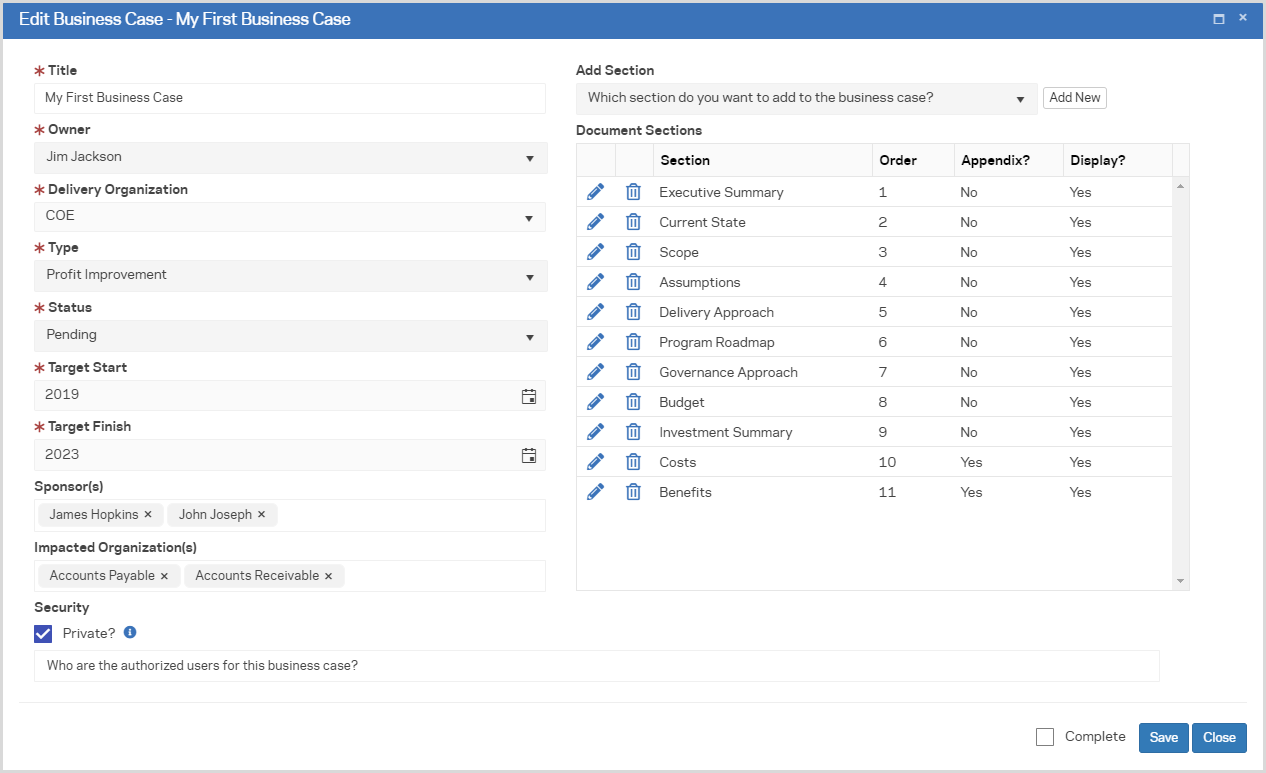 Show and hide sections to display and export myriad business case versions.