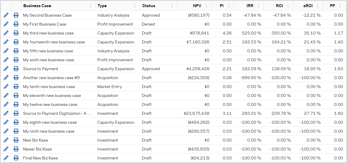Filter and assess business cases by organization, status or type.