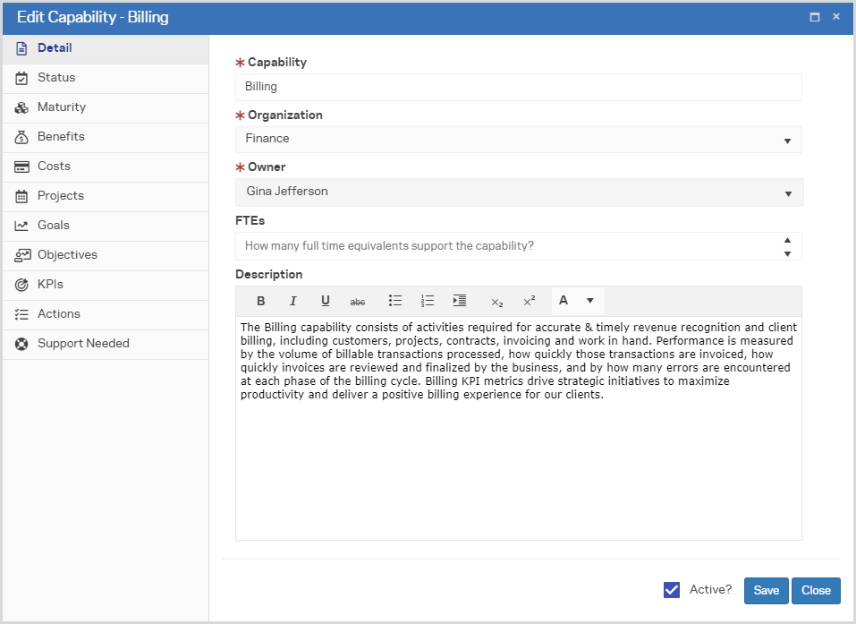 Visualize business capabilities through smart goals, objectives and KPIs to inform on operational health and identify opportunities to improve capability maturity.